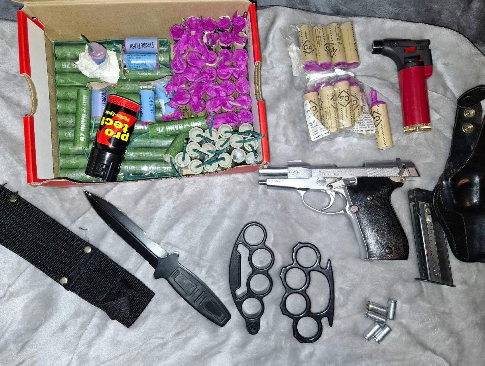 Polisin paylaştığı bilgilere göre odada bir bıçak, iki muşta, aksesuarlarıyla birlikte bir kurusıkı tabanca ve yasaklı piroteknik bulundu. Çocuğun, ele geçirilen eşyaların kendisine ait olduğunu söylediği aktarıldı.